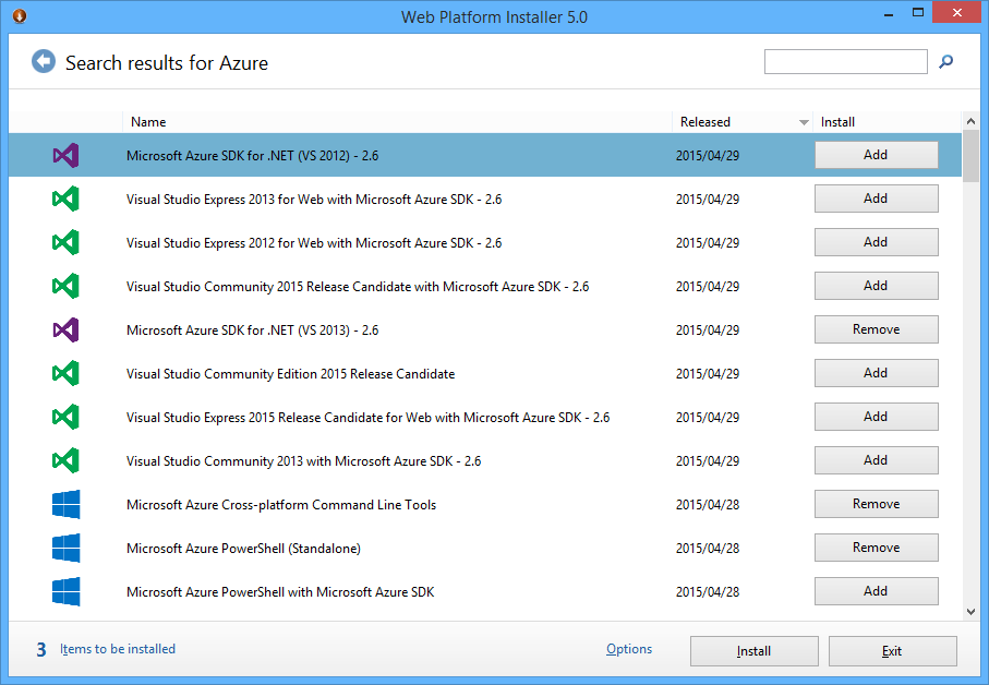 ちなみにVisual Studio Enterprise 2015 RC 用(Azure SDK for .NET (VS2015))が一覧にないですけど、Visual Studio Enterprise 2015 RCのクラウドプロジェクトでSDKをダウンロード的なリンク選ぶとインストールできます。謎。(こちらからでもどうぞ)