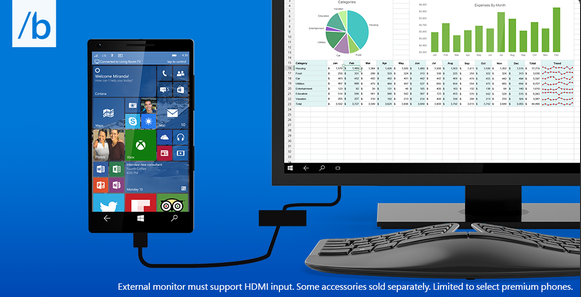 面白いのはContinuum for PhonesということでWindows Phoneに外部モニタとキーボード接続してそのままPCっぽく使えるようになる機能ですね。