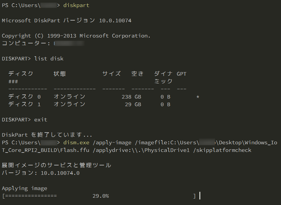 OSイメージをmicroSDに書き込むにはBuild 10069以上のWindows 10に含まれるDISMが必要になります。面倒くさいけど注意。microSDに書き込むコマンドはこんな感じです。