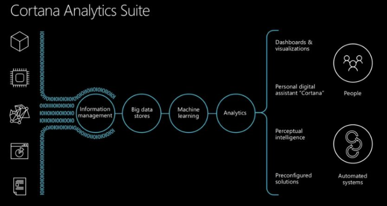 さまざまなセンサーやアプリケーションなどのデータを保存・解析・機械学習してCortanaがアクションを起こす、提示する、可視化するというような一連の関連サービスをまとめたスイートです。リアルタイムでも。他の事例的な話では病院の医療システムで患者の履歴やプロフィールなどと広範囲な事例から能動的な治療計画を提案したりなどに使われてるようです。