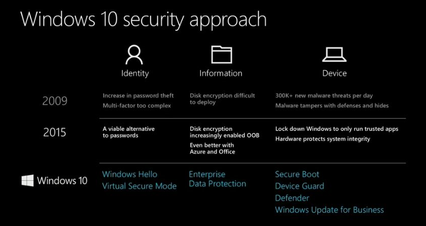 2015年のアプローチとしては認証周りでWindows Hello、Virtual Secure Mode、情報はEnterprise Data Protection、デバイス保護ではSecure Boot、Device Guard、DefenderとWindows Update for Businessという感じです。