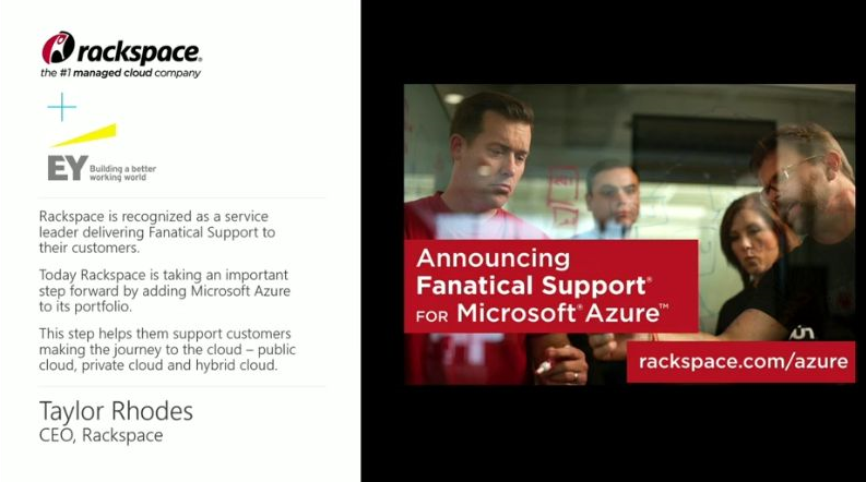 面白いのはRackspaceのCEO、Taylor氏が登壇してAzure対応を話したところですかね。![]()