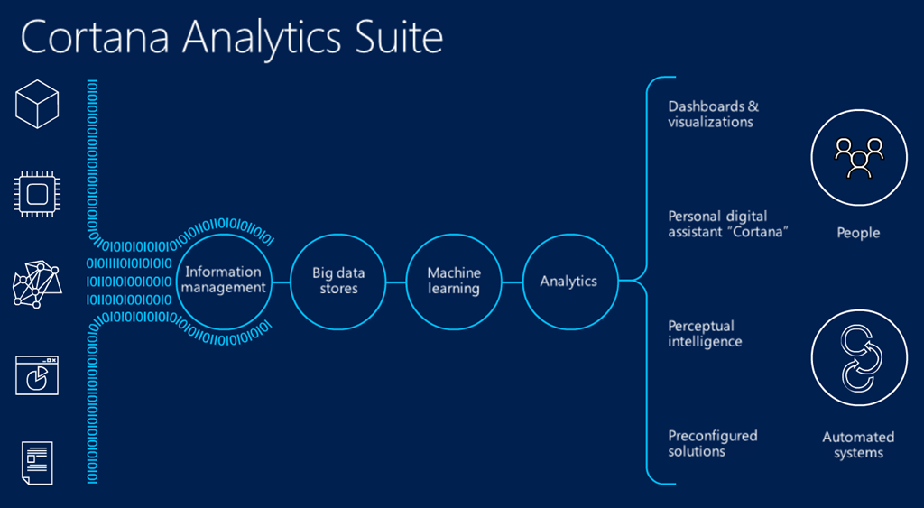 Cortana Analytics Suiteはそれらを処理するためのサービス群です的な。また最終的な知的な行動としてダッシュボードにまとめたり視覚化したり、Cortanaというパーソナルデジタルアシスタントに任せたり自動化したり。![]()