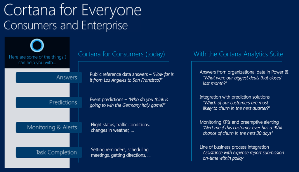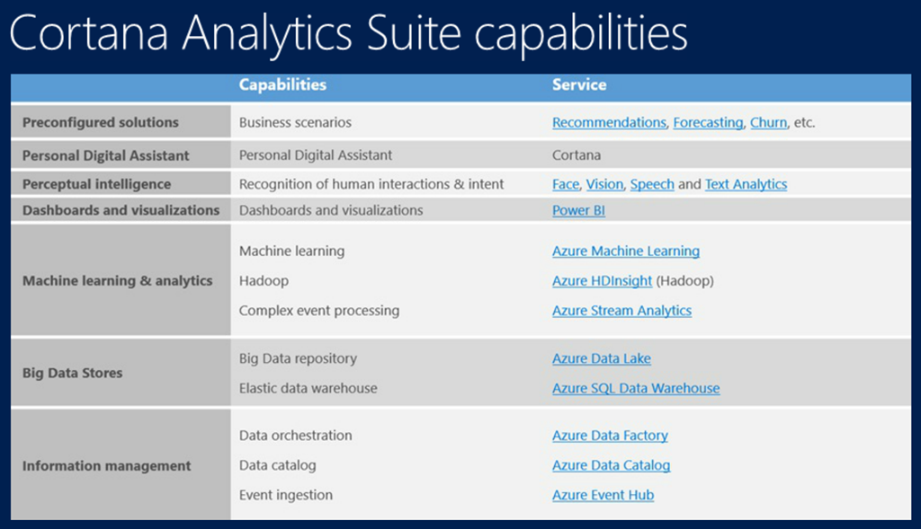 さてそんなみんなのためのCortanaさんですが、Consumer向けはご存知の(?)通り。Enterprise向けとしてのCortana Analytics Suiteは以下のような感じになります。![]()