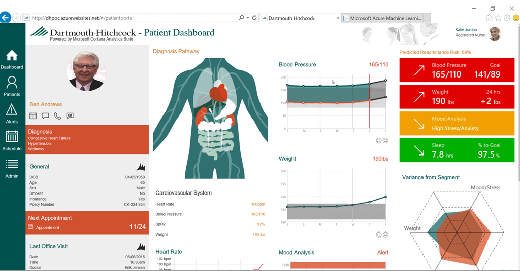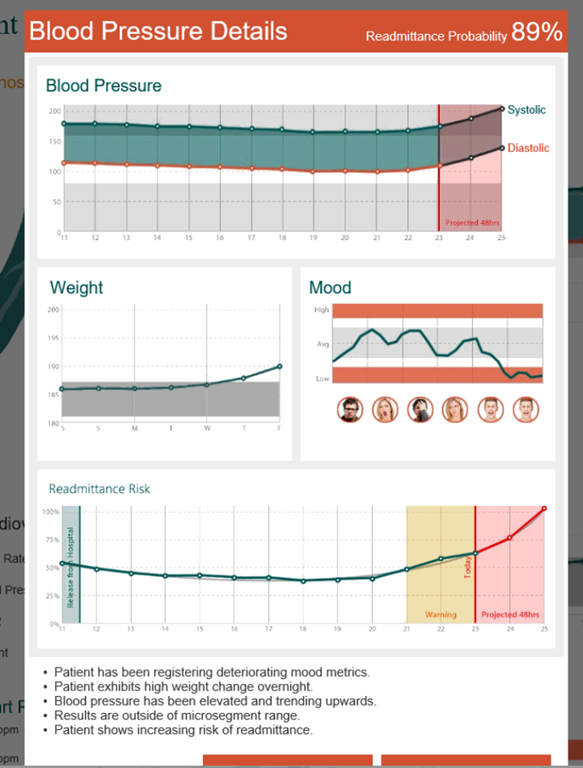 患者のデータ(心拍数や感情、体重などなど)から異常を検知してアラートを上げたり、家族に薬飲んでることを通知したりとか積極的な医療(というのかなんというか)に使っています。動画はこちら