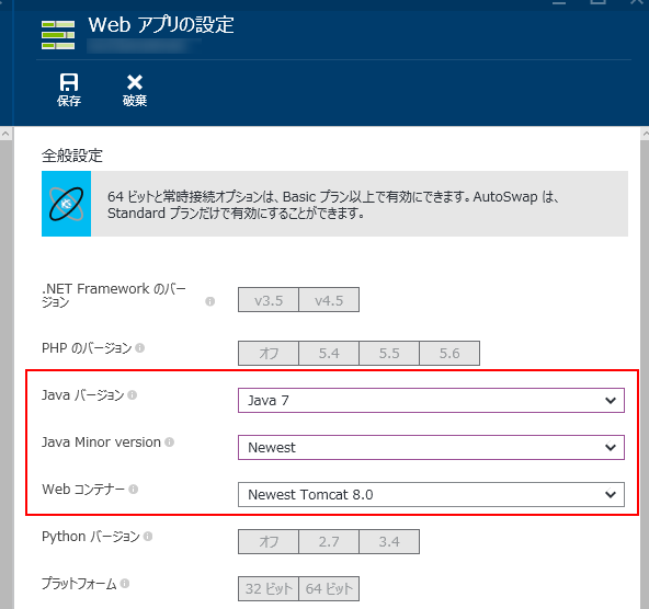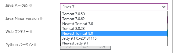 Javaのバージョンを選択するとマイナーバージョン(最新または細かい指定)できるのとWebコンテナーも結構細かく指定できるようになりました。![]()