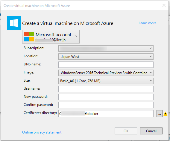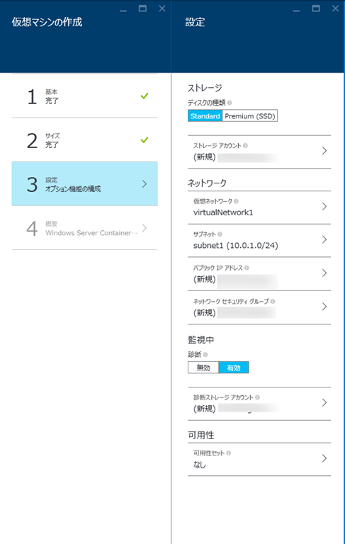 Azureポータル上でMarketplaceから「Windows Server Container Preview」を選択して必要項目を入力して作成するだけで立ち上がります。便利ですね。