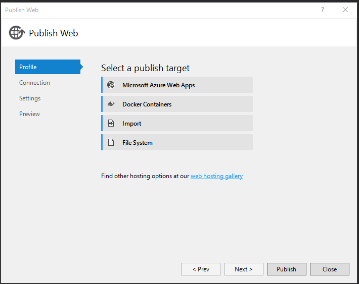 ただ発行ウィザードから作らず、先に作っておいたWindows Server ContainersのイメージのDockerホストに対して発行あれこれする場合、証明書作ったりTCP/2375ポートあけたり、自分ですることが多いです。(ま、この辺はやりようですけど)※ ウィザード内で作成する場合は必要な証明書など生成・設定してくれます(結局Dockerコンテナで使うポートなどは自前で設定しないといけない気がしないでもない)