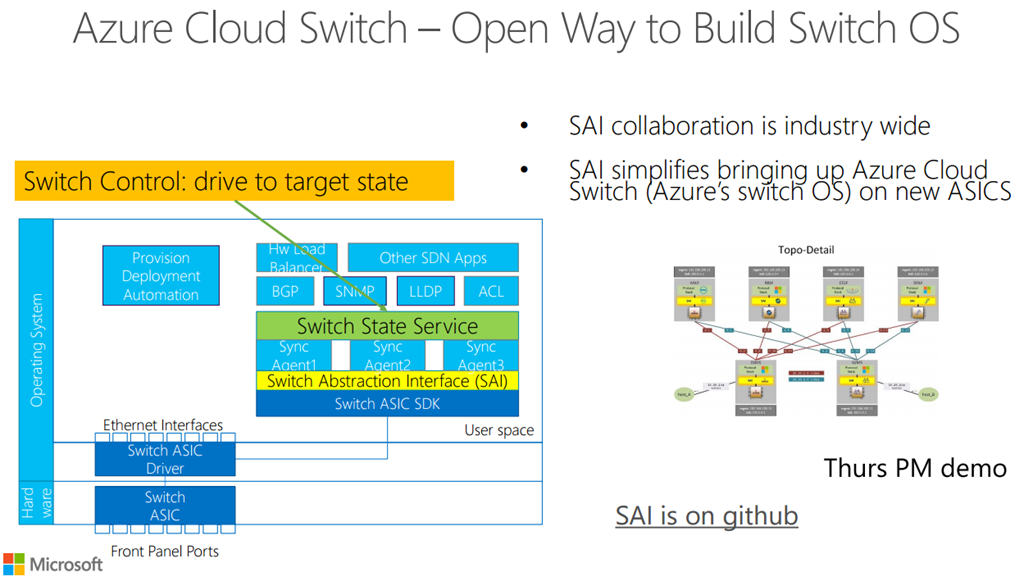なぜACSが必要なのか、なぜLinuxなのかといった解説されてます。もともとMicrosoftはAzureといったクラウドのプラットフォームの提供以前からOffice 365(の前身であるBPOS)、もっと前ではBing、Live Services(なつかしい)といったインターネット上のサービスを自社のデータセンター上で提供していました。これらのサービスをより効率よく高速にさばく為にデータセンターそのものやネットワークに対してかなりの労力を費やしていたと思います。昨今ではプラットフォームとしてネットワーク層も含めユーザーに提供するようになり、より高速で高可用性なネットワークのインフラを構築しユーザーや企業に提供していく必要がでてきたのは自明だと思います。MS的にはスイッチ等のハードウェアに新しい技術革新が来たとしても自前実装したクラウド全体のネットワーク管理プラットフォームなソフトウェアが(バグが含まれてたとしても)そのまま動いて欲しいと思ってるようですたぶん。