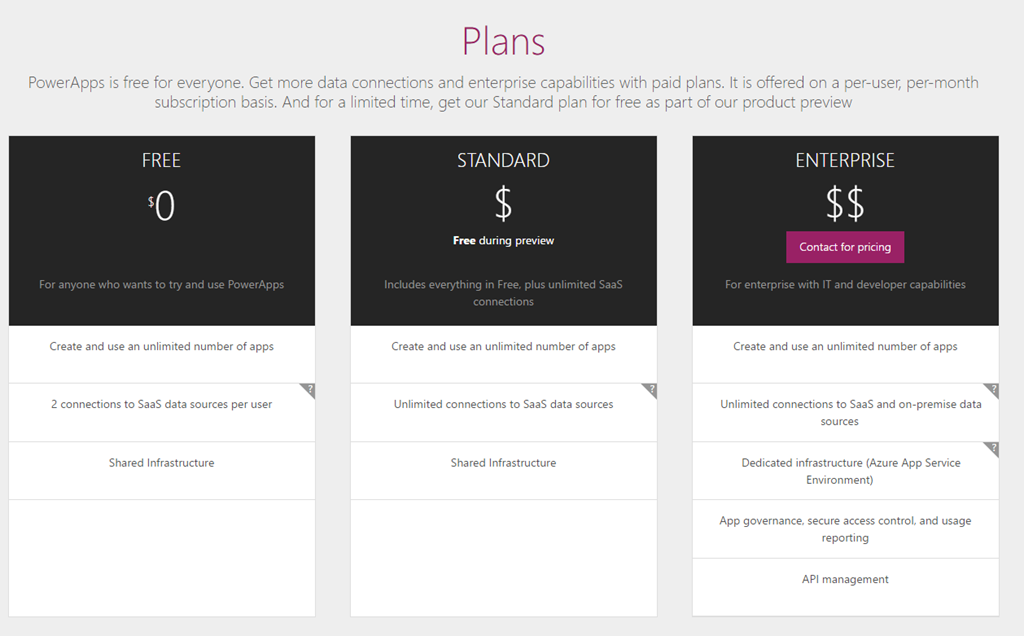 まだまだ価格はでてないですね。StandardはPreviewの間、無料ぽいです。Free/StandardはおそらくそれぞれAzure App ServiceのFree/Standardなところの制限がついてきそうですね。Enterpriseを選ぶとAzure App Service Environment使えたりAPI Managementやリポートなど充実してそうです。