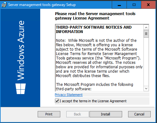 ゲートウェイとなるサーバー上でダウンロードしたパッケージのMSIファイルを実行しインストールします。(一緒に含まれているprofile.jsonファイルも必要なので注意しましょう)![]()