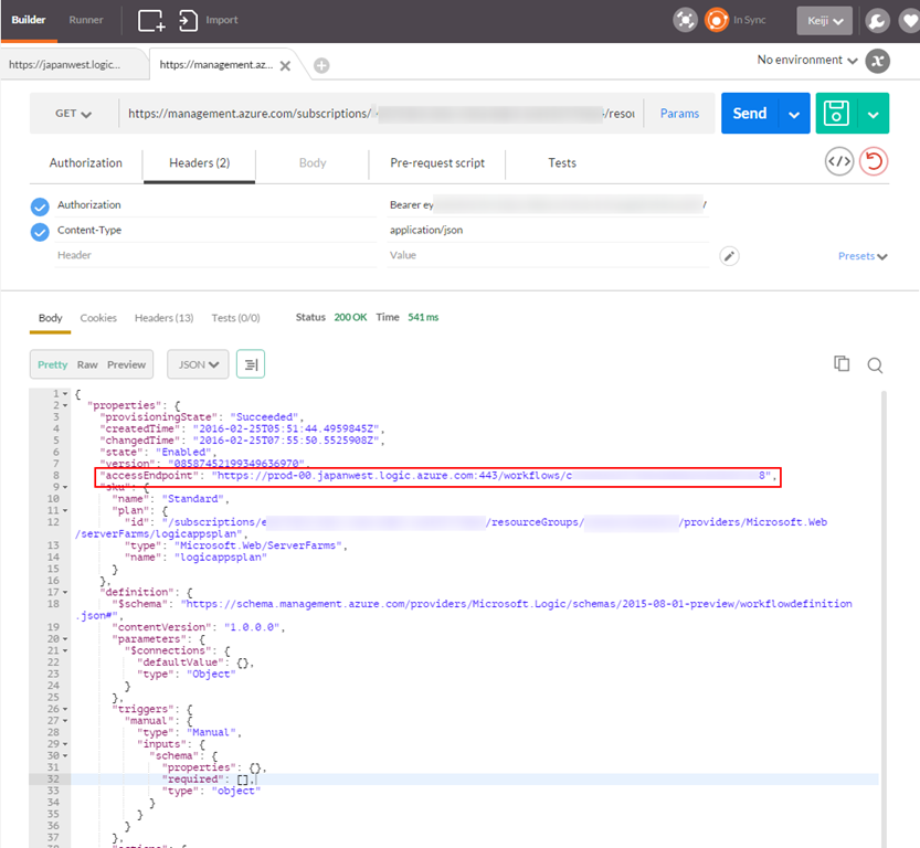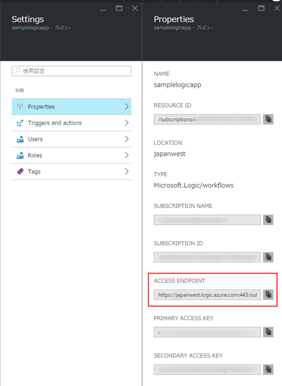 "accessEndpoint": "https://japanwest.logic.azure.com:443/subscriptions/{subscription id}/resourcegroups/{resource group name}/providers/Microsoft.Logic/workflows/samplelogicapp",