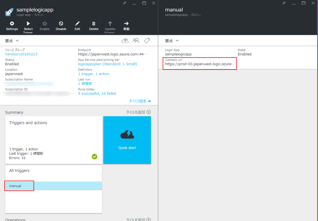 Logic AppsのブレードのAll TriggersからManualを選択してCallback Urlの値をコピーします。![]()