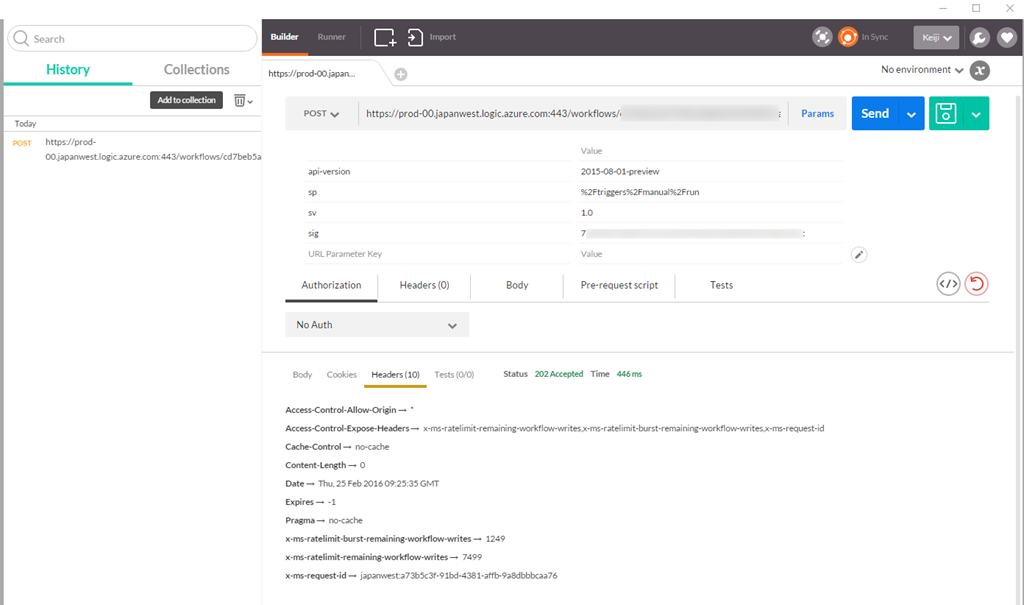 これでワークフローが実行されます。正しく実行されればHTTPのレスポンスが202で返ってきます。