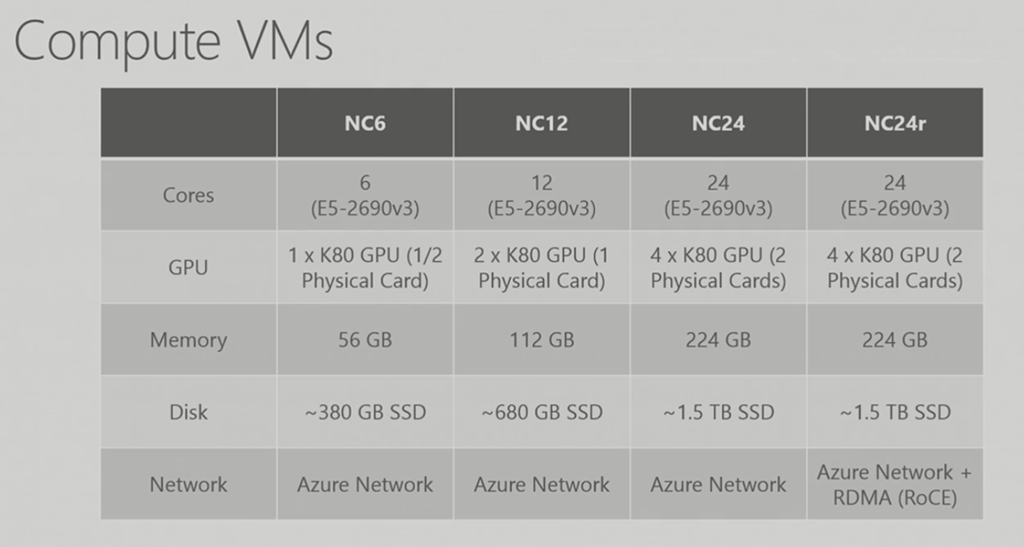 次はコンピュートなSKUです。こちらはNC6、NC12、NC24、NC24rという感じ。NC24rはネットワークにRDMAも使えますね。![]()