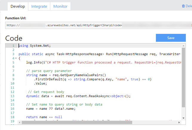 Codeのテキストエリアで直接コードを編集します。編集が終わったらSaveしましょう。(C#の場合、Saveした後コンパイルが行われます)