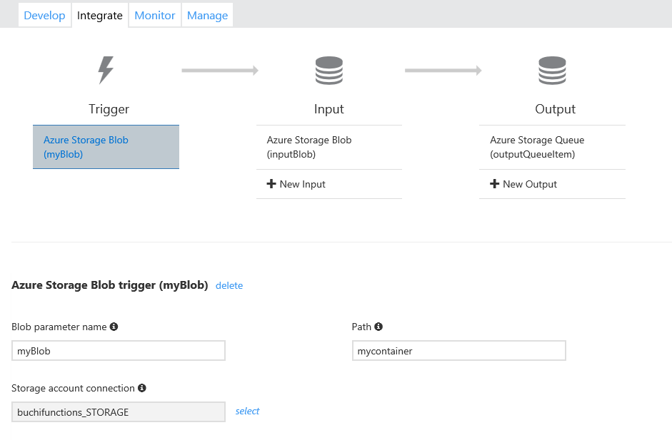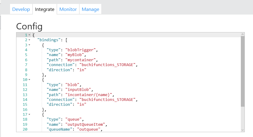 トリガーは1つ、InputおよびOutputのバインディングは複数指定可能です。またこれらの設定の実体はfunction.jsonファイルとして保存されているので直接編集することも可能です。(右下にあるAdvanced Editorのリンクから編集することもできます)