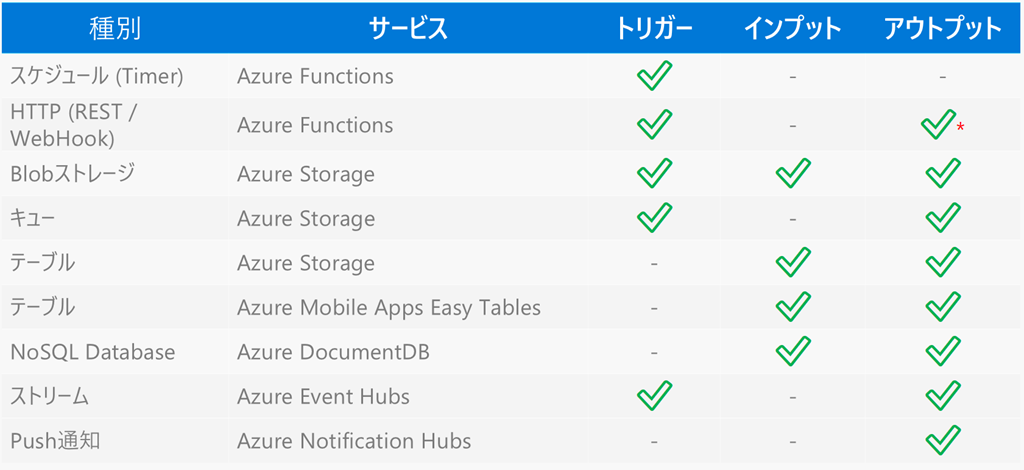 * HTTPのアウトプットはHTTPトリガー使用時のみ利用可能です。
