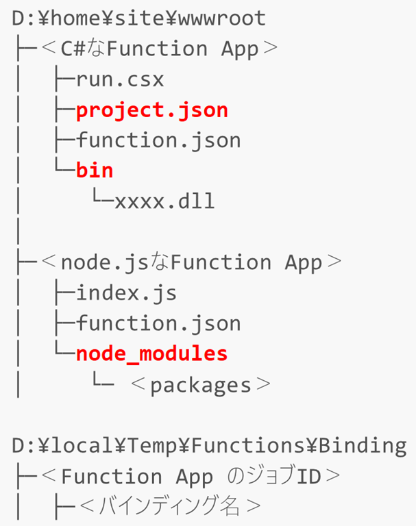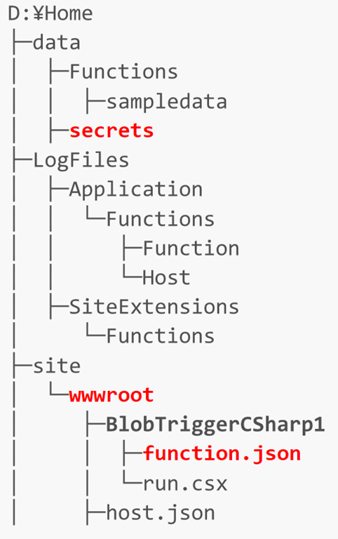 またSite\wwwrootフォルダ以下にFunction App名なフォルダと必要なファイル(function.jsonとrun.csxなど)があればよいのでFTPやWeb Deployなどを使用してデプロイすることも可能です。あるいは環境によりますが、Azure File Storage上の共有フォルダを直接マウントして編集(あるいはフォルダごとコピーなど)することで展開することもできます。
