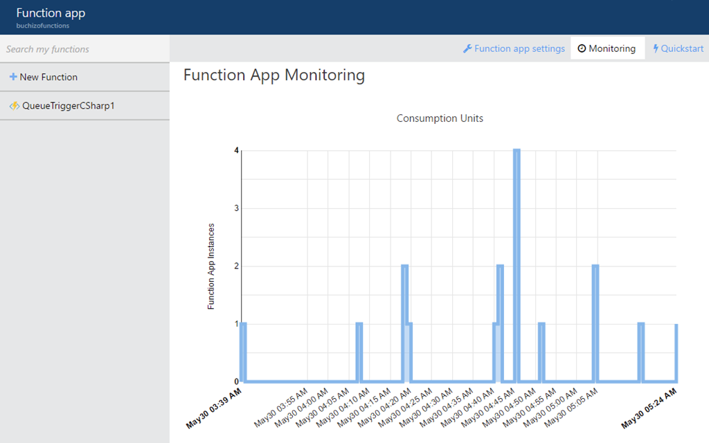 Function App単位のログやライブな実行状況などは各Function AppのMonitorから行えます。