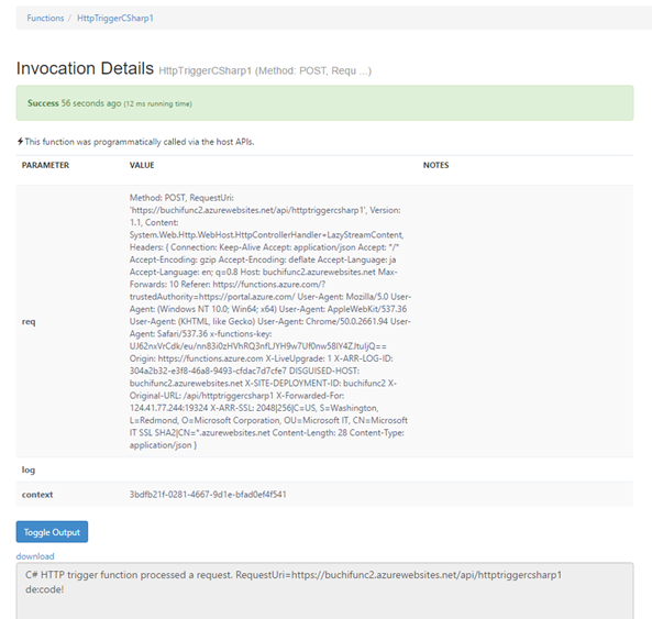 詳細を見ることでFunction Appのログで見た内容(Outputの内容)やバインドされた各値の内容など参照できます。