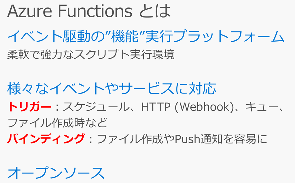 Azure Functionsではそのための機構が提供されてて、スクリプトベースで処理に関する記述だけに注力できます。またアクションを受ける部分、アクションしたい先についてはトリガーとバインディングという機構が提供されててその部分の開発をかなり省くことができるようになっています。