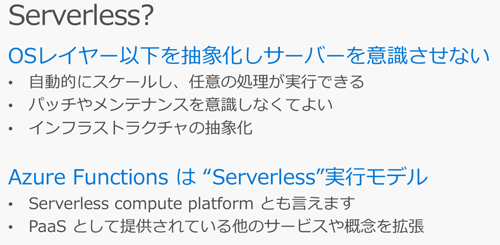 よく言われるのはServerlessという言葉ですが、「OSレイヤー以下を抽象化しサーバーを意識させない」という点でAzure FunctionsはServerless Compute Platformとも言えます。
