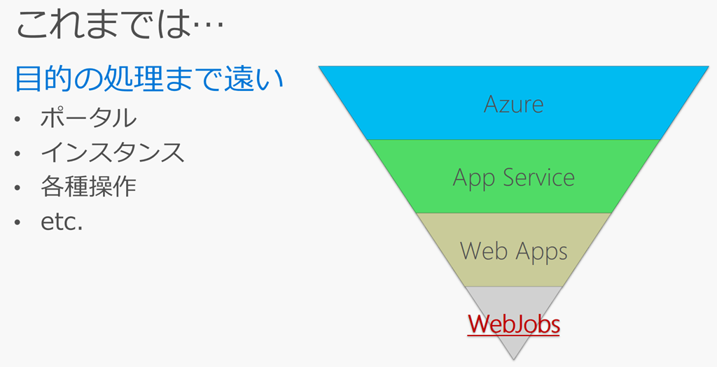実はAzure Functionsに似たような機能はWebJobsとしてApp Service Web Apps上で実行できていました。これはこれでバインディングだったりトリガー機構は持っててAzure Functionsの原型ともいえるサービスでしたが、扱うためにはWeb Appsなりをある程度知ってないと構成したり管理するのが難しいところでした。