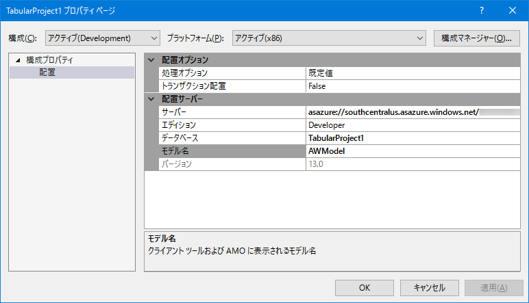 SSDTのプロジェクトを作って適当にDBからインポートして弄った後、プロジェクトのプロパティを開いて配置サーバーをAzure Analysis Servicesの接続文字列に変更します。![]()