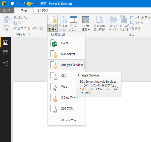 ※環境によってはAzure Analysis Servicesから接続できないためエラーになることがあります。その場合はOn-Premise Data Gatewayをインストールするなりして中継して接続できるようにします。(ただ環境のせいかOn-Premise Data Gateway経由だとデータのペイロードがおかしいだとかでエラーになってデータそのものの配置はエラーになりました)