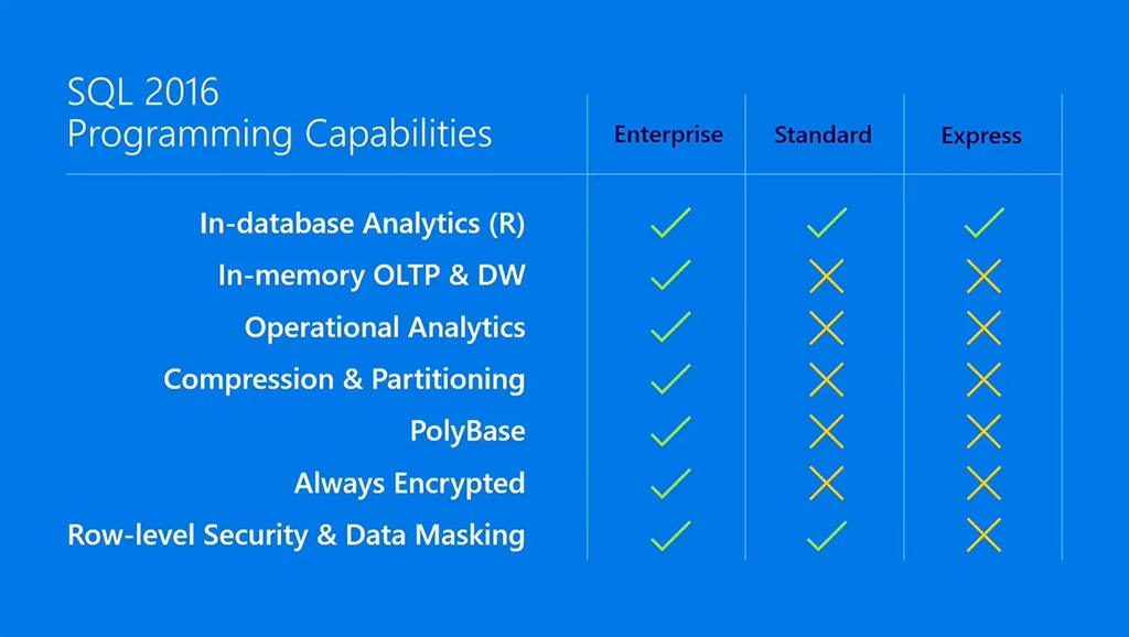 これがSQL Server 2016 SP1では全エディション同じになります!(ただしスライドに挙がっている機能が。)![]()