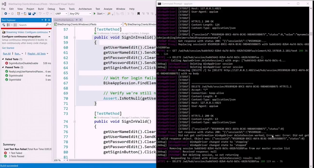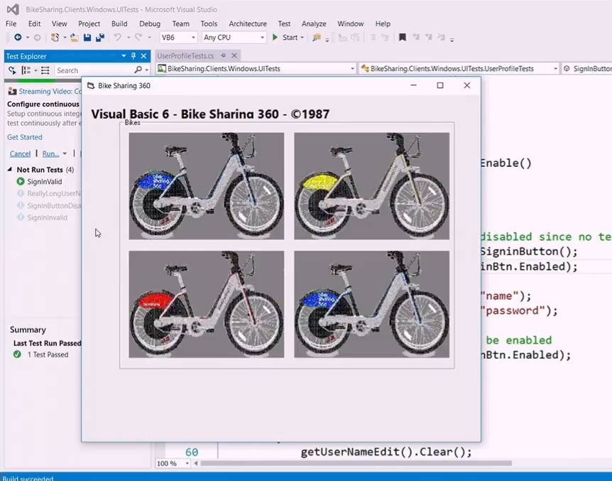 次のデモはStacey氏。Unitテスト系のデモですね。サインイン時のチェックがバグってる(テスト通らない)というあたりのシナリオでデモしてました。UIテストな感じのやつですね。なおVB6も登場してました。。![]()