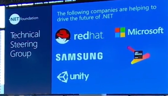 後は.NET Ecosystemの話ですね。どのOSでもどのプラットフォームでも。現在.NET Foundationに参加しているのはMicrosoftのほかにRedHatやSAMSUNG、Unity、JetBrainsがいます。![]()