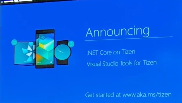 そしてSAMSUNGからのアナウンスとしてはVisual Studio tools for Tizen。エミュレーターもあるし、実際にスマートウォッチ上でも動作させてます。で、突然ハンセルマンが走ったと思いきや壇上にあったモニタ(じつはサムスン製)上でもアプリを動かしました。![]()