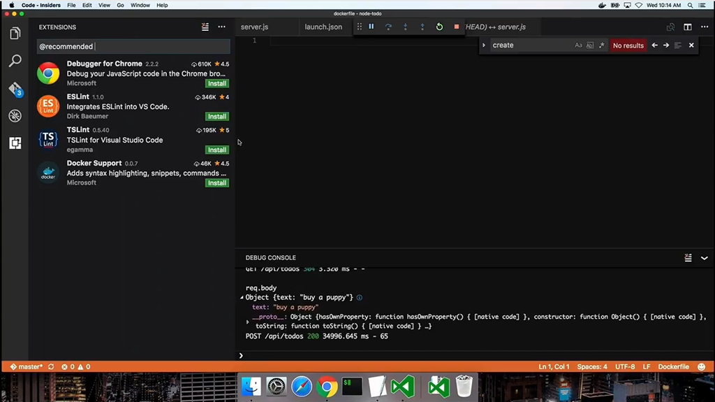 VSCode上でnode.jsアプリをさくっと作ってローカルホスト上のMongoDB使ったりデバッグしたりもできます。エクステンションもたくさんありますね。![]()