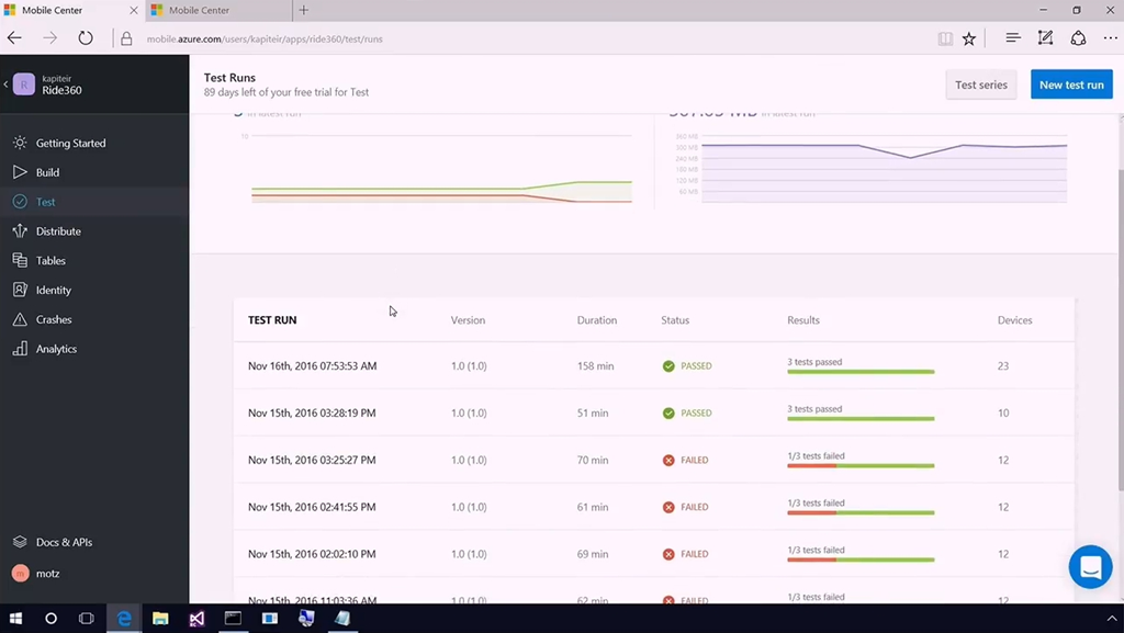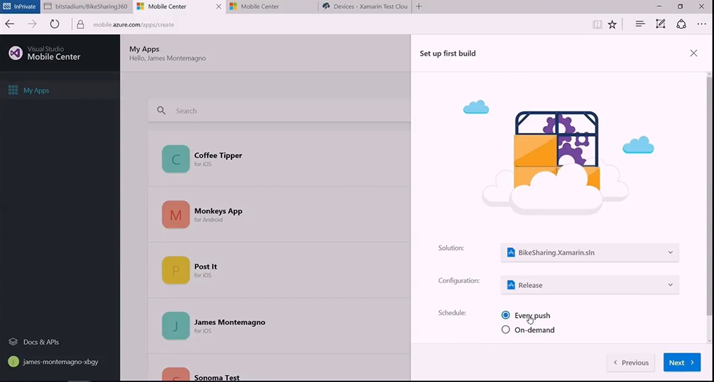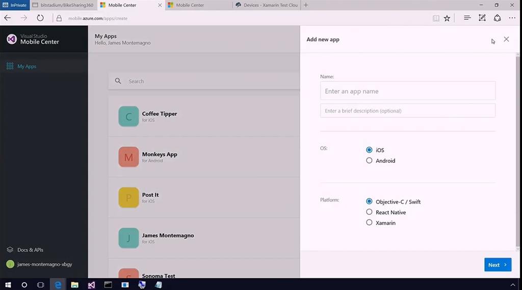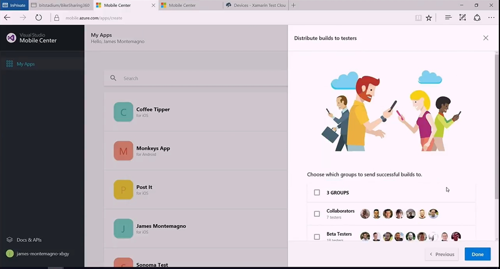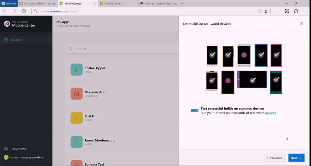 またモバイル開発(に限りませんが)テストやビルド、デプロイ、分析、配布などたくさんのプロセスが必要ですよね。ということでそのあたりを助けるVisual Studio Mobile CenterがPreview公開です。GitHubと連携してモバイルアプリのリポジトリ作ったり、テンプレートから選んだり。コミットがあったらビルドしてテストしたり、Xamarin Test Cloudと連携したり、問題なくビルド・テストが終わったアプリをベータテスターに通知・配布したりすることができます。![]()