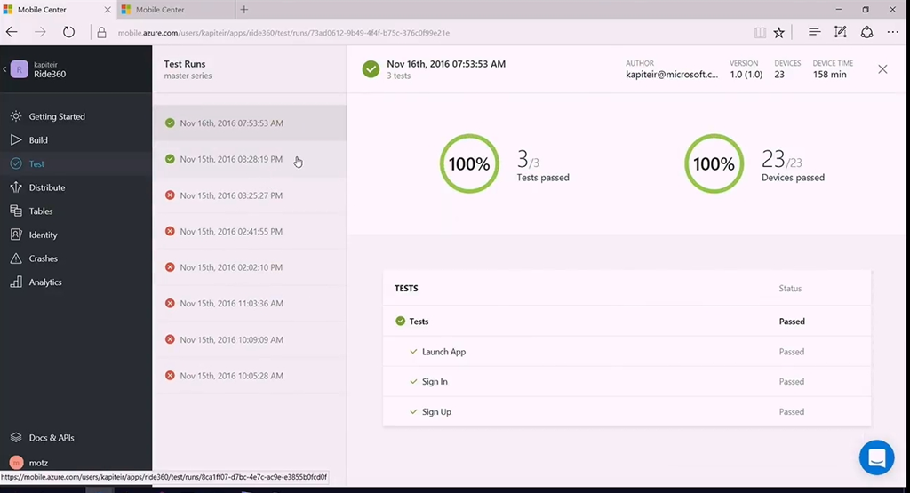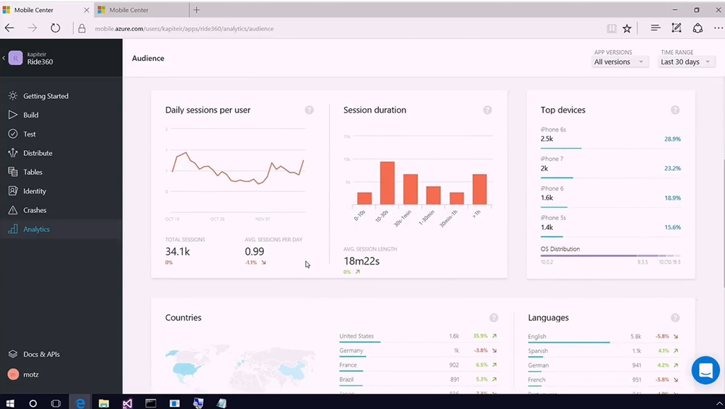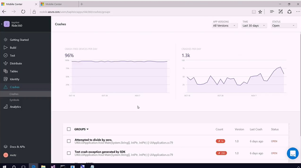 また配布したアプリの稼働状況やエラー情報をみたりなども統合して行えます。(裏でAzureのHockeyAppが使われてそうな雰囲気ですね)
