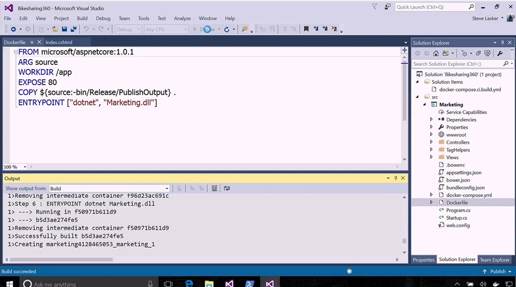 ということでVisual Studio tools for Dockerのお話。デモはDonovan氏から。メニューからDockerサポートを選ぶとdockerfileなどが追加されます。でビルドするとDockerコンテナーのイメージがビルドされます。修正・ビルド・再実行も素早く簡単に。![]()
