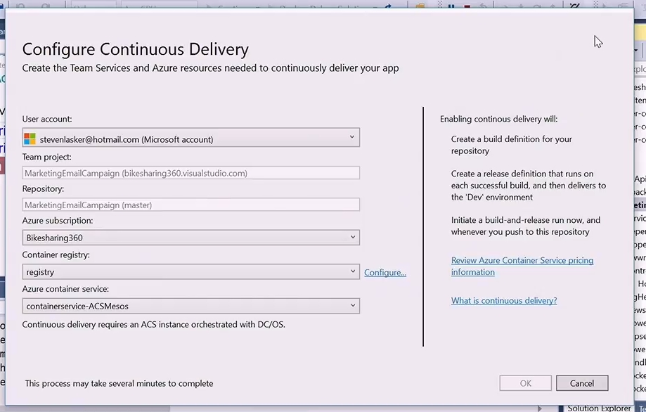 また、Visual Studio Team ServicesがDockerコンテナーをサポートです。Docker Composerのファイル(Yaml)を置いておけば適切に処理してくれそう。あとは継続的デプロイの設定もVisual Studio上から簡単に。Azure Container Serviceへデプロイしてました。![]()