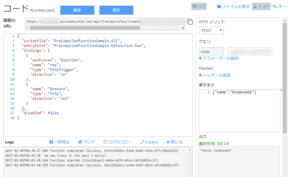 後はfunction.jsonと対象のアセンブリだけ放り込めばコンパイル処理はスキップされて実行されます。