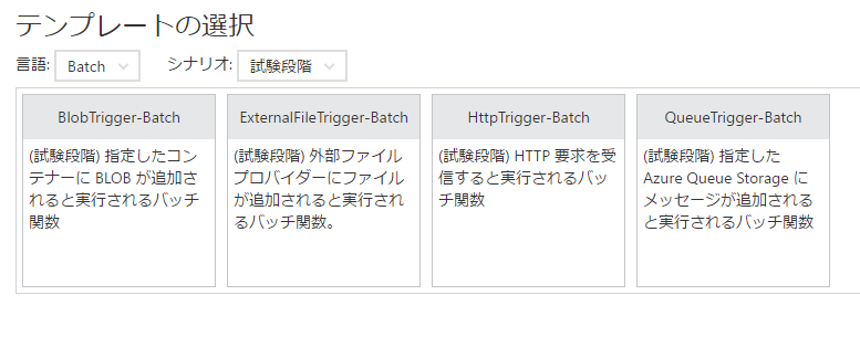 Azure Functions上でBatchで新規Functionを作ります。ここではQueueTrigger-Batchを使います。![]()