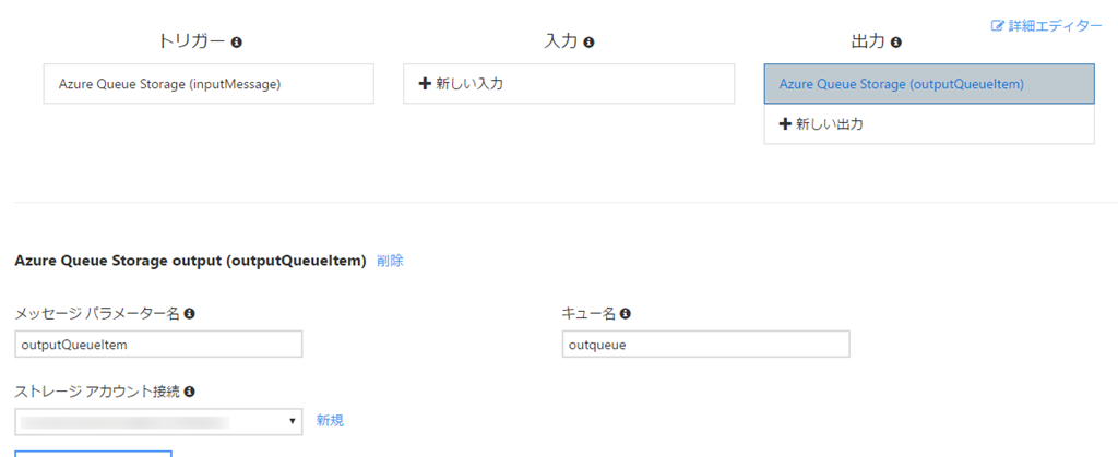 サンプルコードとしては環境変数に放り込んだInputのQueueを読みだして outputQueueItem で指定したQueueに大文字に変換した文字列を出力しています。なのでOutputのBindingも設定しておきましょう。![]()
