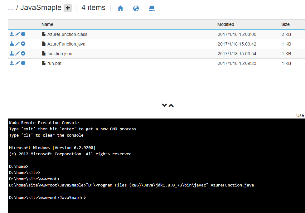 「Function Appの設定」から「Kuduに移動」で表示されたKuduのDebug Console上で対象のFunctionのフォルダまで辿ります。(例:D:\home\site\wwwroot\JavaSmaple )