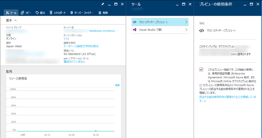 SQL Databaseのブレード上で「ツール」を選んでクエリ エディターを選択します。(初回にPreviewの使用条件に許諾する必要があります)
