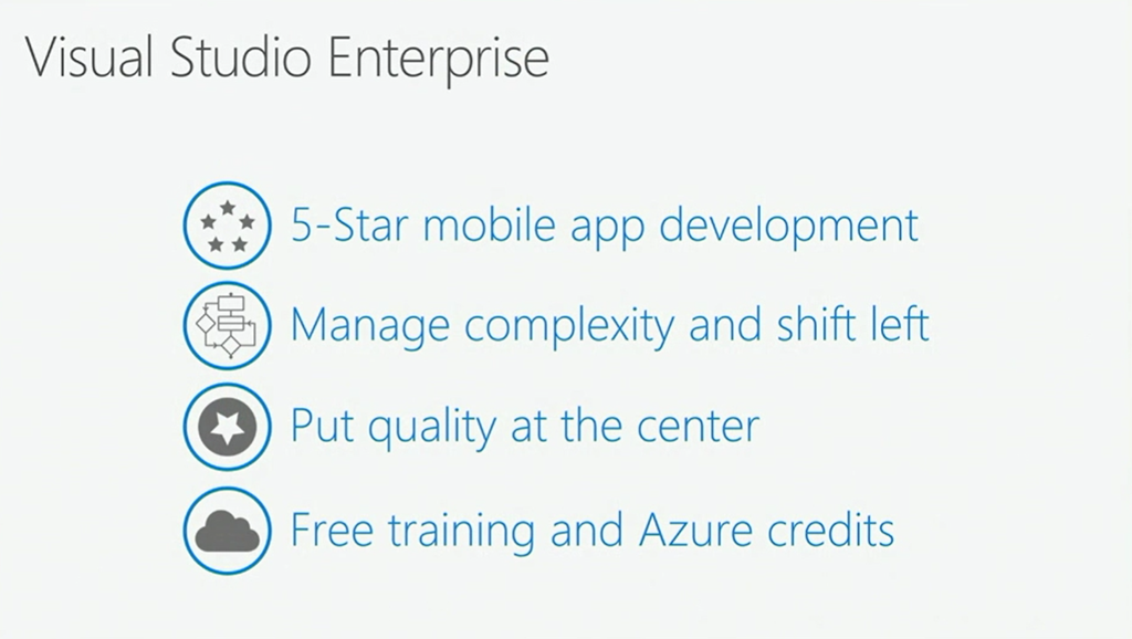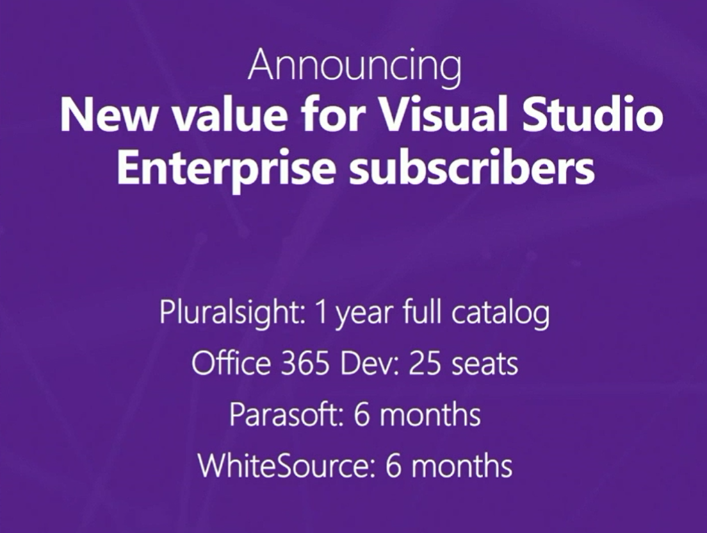 Enterpriseのサブスクライバーには新しく1年間のPlurasight、Office 365 Devを25シート分、Parasoft6か月分、WhiteSource 6か月分など。またEnterprise DevOps Acceleratorもアナウンスされました。![]()