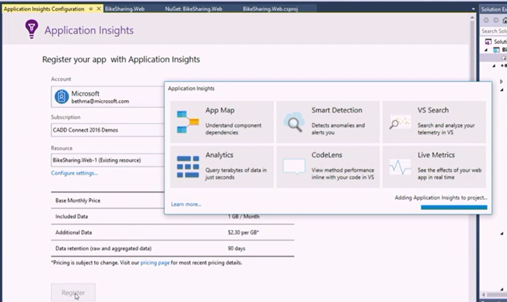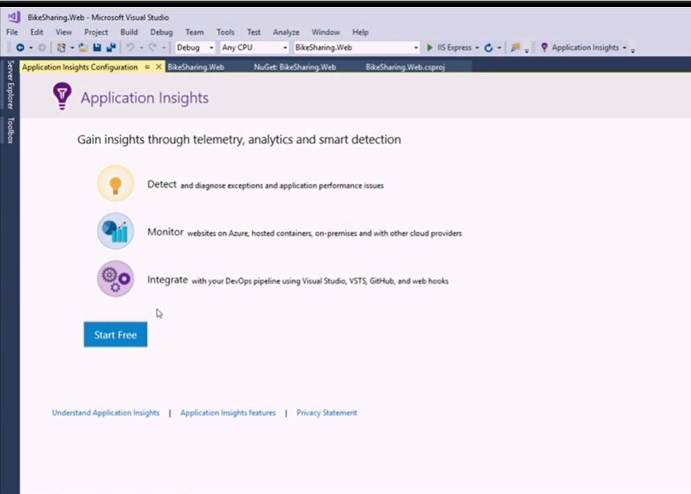 Azure統合周りだとApplication Insightsとか公開まわりとか。Application Insightsで収集したデータはVisual Studio内でも参照できます。![]()