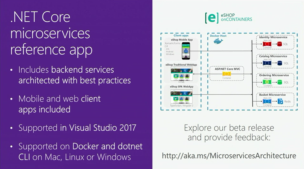 .NET Core microservices リファレンスアプリケーションとして、コンテナーなどを使ったサンプルも用意されました。![]()
