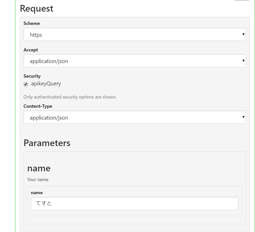 ※ もしAPI定義を編集してSaveしてもテストUIのパラメーターなどが反映されない場合はTry this operationで開いた部分をcloseボタンで閉じてから再度開きなおすか、API Definitionのページを再度開きなおせば反映されます。
