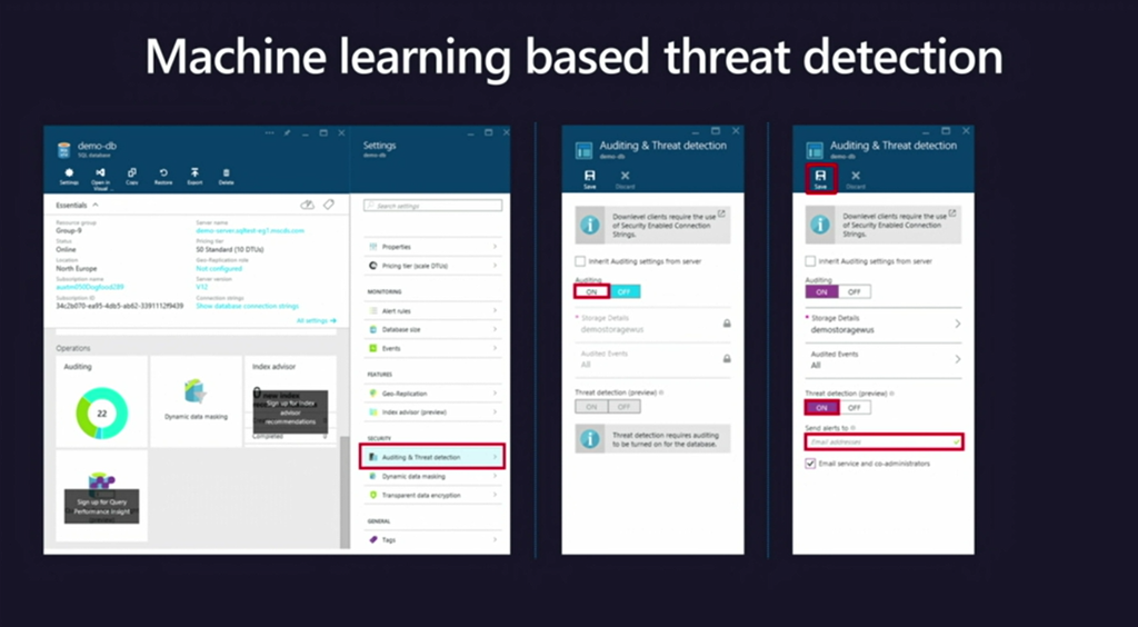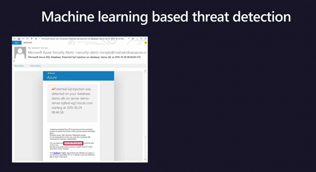 次はTrustedなところ。データをより安全に。SQL Databaseでは機械学習で数ステップの設定で自動的に攻撃などを検知して保護、メールで通知などしてくれます。![]()