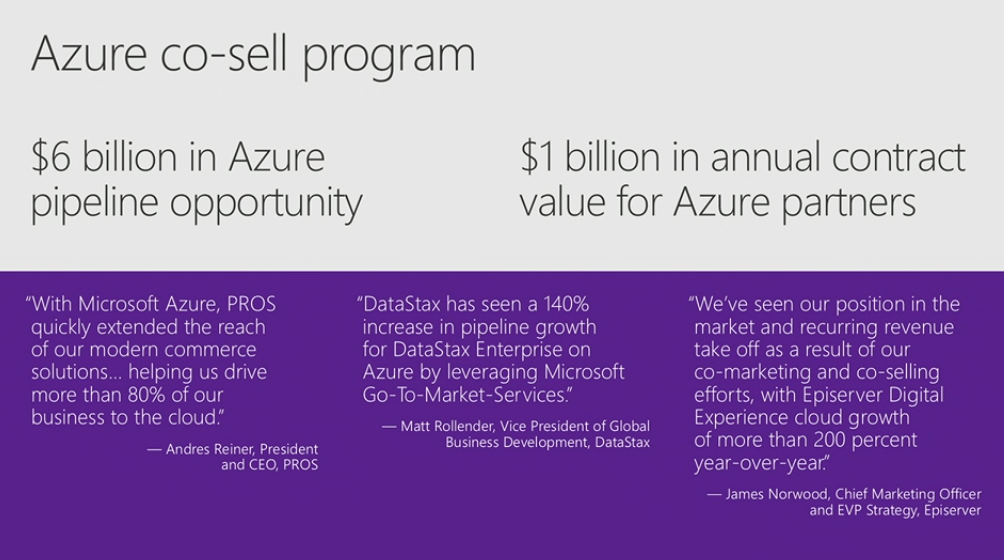 トップバッターはCVPのRon氏から。パートナーアワードのWinner紹介とかですね。後はパートナーやISV向けにざっくり傾向とか市場の話しやAzureのCo-Sell Programの話とか。